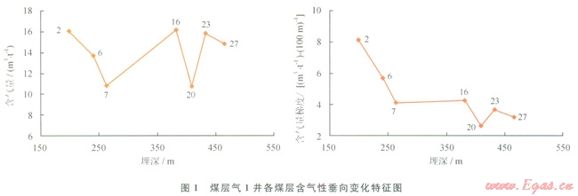 處于織納煤田比德三塘礦區(qū)的煤層氣l井,其各可采煤層(2、6、7、16、20、23、27號煤層)實(shí)測含氣量與含氣梯度隨層位降低均呈波動式變化(表1,圖l)。