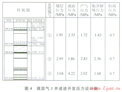 由于各含氣系統(tǒng)壓力不同,合層排采會產(chǎn)生層間干擾。煤層氣l井鉆井、固井結(jié)束后,由靜止液而高度計算得出①、②、③號含氣系統(tǒng)的液而壓力分別為2.55、3.86、4.22MPa(圖4),分別比各系統(tǒng)的儲層壓力高0.6、0.91、1.18MPa,若井孔處理不干凈的話,對煤儲層有一定程度的污染?;趯?shí)測含氣量、蘭格繆爾參數(shù)計算①、②、③號含氣系統(tǒng)的臨界解吸壓力分別為1.43、2.36、1.68MPa,產(chǎn)氣壓力分別為l.72、2.83、2.02MPa(基于山西沁水盆地南部煤層氣井排采實(shí)踐,產(chǎn)氣壓力約為臨界解吸壓力的1.2倍[16-19]。依據(jù)煤層氣l井各系統(tǒng)內(nèi)煤儲層壓力、臨界解吸壓力和產(chǎn)氣壓力,對3個含氣系統(tǒng)設(shè)計了遞進(jìn)開發(fā)次序。