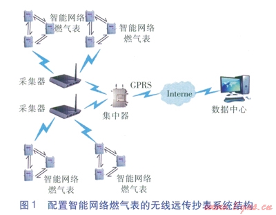 配置智能網(wǎng)絡(luò)燃氣表的無線遠傳抄表系統(tǒng)結(jié)構(gòu)見圖l。無線遠傳抄表系統(tǒng)包括智能網(wǎng)絡(luò)燃氣表、采集器、集中器、數(shù)據(jù)中心等。