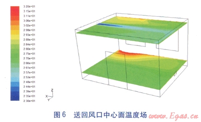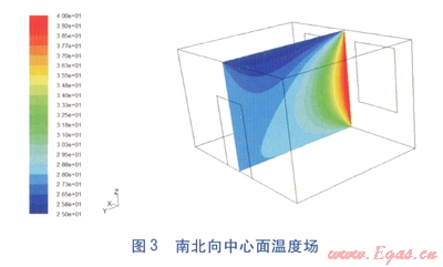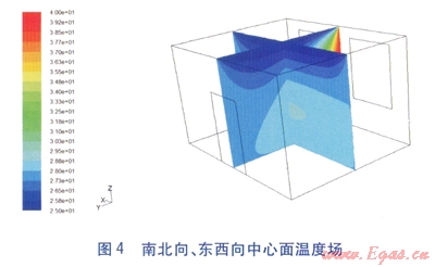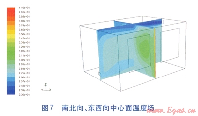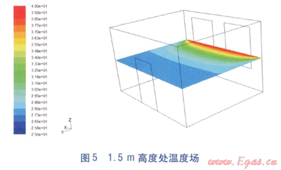 由于室內(nèi)溫度場(chǎng)是三維場(chǎng),因此選取其中最有代表性的3個(gè)切面進(jìn)行分析:南北向及東西向的中心面、人員工作區(qū)距地面1.5m的平面。南北向中心面溫度場(chǎng)見(jiàn)圖3,南北向、東兩向中心面溫度場(chǎng)見(jiàn)圖4,1.5m高度處溫度場(chǎng)見(jiàn)圖5。