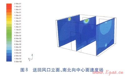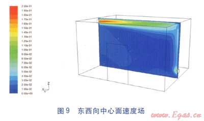 在模擬單純采用毛細(xì)管輻射供冷系統(tǒng)室內(nèi)流場(chǎng)的基礎(chǔ)上,對(duì)新風(fēng)除濕輔助毛細(xì)管供冷系統(tǒng)的室內(nèi)流場(chǎng)也進(jìn)行了模擬,送風(fēng)口位于東側(cè)墻距頂面0.2m居中位置,回風(fēng)口位于西墻距地面0.2m居中位置,送風(fēng)溫度l8℃,送風(fēng)風(fēng)速3m/s。