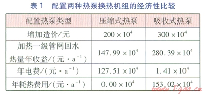 配置兩種熱泵換熱機(jī)組的經(jīng)濟(jì)性比較見(jiàn)表l,熱價(jià)按57.92元/GJ計(jì)算,電價(jià)按0.854元(kW·h)計(jì)算。由表1可計(jì)算得,配置壓縮式熱泵的換熱機(jī)組年凈收益為20.48×104元/a,增加造價(jià)200×104元,投資回收期約l0a。配置吸收式熱泵的換熱機(jī)組年凈收益為l25.96×104元/a,增加造價(jià)300×104元,投資回收期約3a。