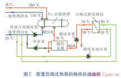 配置壓縮式熱泵的換熱機(jī)組流程見(jiàn)圖2。