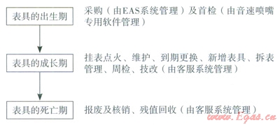 如何實現(xiàn)這一管理目標(biāo)呢?信息化建設(shè)必然首當(dāng)其沖。通過建設(shè)和完善現(xiàn)有的客戶綜合管理信息平臺,實現(xiàn)燃?xì)獗硇畔⑷鞒坦蚕砉芾?。目前已設(shè)計并實現(xiàn)了燃?xì)獗硎状螔毂?、日常換表、到期表更換、新增表具、拆表管理、整樓拆除、工商戶流量計周檢管理和日常維護(hù)、報廢表具核銷等業(yè)務(wù)模塊,初步建立了完整的燃?xì)獗砭呷芷诠芾砹鞒?,并與EAS財務(wù)系統(tǒng)數(shù)據(jù)共享,為“燃?xì)獗砭呷芷诠芾?rdquo;提供了操作平臺。燃?xì)獗砣芷诘幕竟芾砜蚣芤殉醪叫纬?,如下?span lang="EN-US">