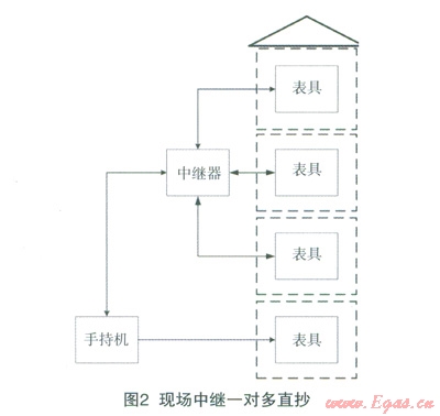 移動(dòng)手抄器通過中繼可與表具之間組成一對(duì)多點(diǎn)的直抄網(wǎng)絡(luò)。移動(dòng)手抄器發(fā)出指令,中繼接收指令后開始直抄,一次喚醒,以此發(fā)送命令,各表具按命令回應(yīng)數(shù)據(jù),最后中繼將數(shù)據(jù)返同給移動(dòng)手抄器。