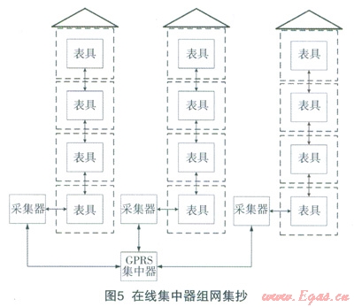 本方式通過小區(qū)內(nèi)加裝GPRS集中器,南集中器控制多個(gè)樓棟的采集器發(fā)起組網(wǎng)集抄。采集器根據(jù)集中器的命令,發(fā)起和中繼器、表具的組網(wǎng)過程并回傳數(shù)據(jù)。組網(wǎng)方式和現(xiàn)場(chǎng)組網(wǎng)集抄方式相同,唯一的不同在于不需要抄表人員到現(xiàn)場(chǎng)用于持機(jī)發(fā)起集抄,(見圖5)。