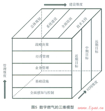 根據(jù)以上討論,我們可以按照管理、建設(shè)、時(shí)間三個(gè)維度來(lái)建立一個(gè)三維的數(shù)字燃?xì)饨ㄔO(shè)模型,這樣可以形象地描述燃?xì)饧瘓F(tuán)(公司)的數(shù)字燃?xì)饨ㄔO(shè)的階段與狀態(tài),圖5所示。