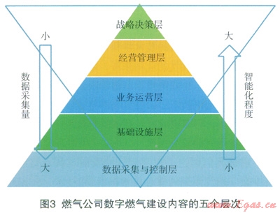 數(shù)字燃?xì)庠谲浖矫姘瑧?zhàn)略決策層、經(jīng)營(yíng)管理層、業(yè)務(wù)運(yùn)營(yíng)層三個(gè)層面的內(nèi)容,硬件方面包含基礎(chǔ)設(shè)施層、數(shù)據(jù)采取與控制層兩個(gè)層面。除此之外,我們認(rèn)為數(shù)據(jù)燃?xì)膺€應(yīng)當(dāng)包括燃?xì)夤镜臄?shù)據(jù)規(guī)范的制定、技術(shù)標(biāo)準(zhǔn)體系的制定、信息安全管理、IT治理與管控,以及系統(tǒng)集成架構(gòu)的建設(shè)等內(nèi)容。圖2是數(shù)字燃?xì)夥懂牭氖疽鈭D。
