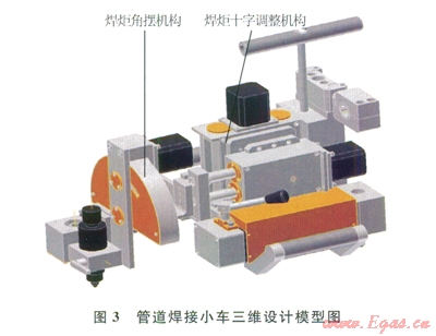 焊接小車主要由焊炬角擺機(jī)構(gòu)與焊炬十字調(diào)整機(jī)構(gòu)構(gòu)成(圖3)。其中,焊炬角擺機(jī)構(gòu)可實(shí)現(xiàn)焊炬最佳的角擺角度和擺動(dòng)頻率,有效避免焊接過程中產(chǎn)生未熔缺陷;焊炬十字調(diào)整機(jī)構(gòu)可實(shí)現(xiàn)焊炬上下位置的調(diào)整與相對于焊縫寬度的左右位置調(diào)整,以滿足管道焊縫不同位置焊絲與管壁的間距要求及寬度要求。