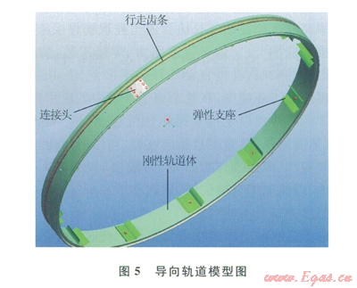 導(dǎo)向軌道采用分體式環(huán)形結(jié)構(gòu),軌道由2塊半圓弧軌道通過連接頭和鎖緊把手連接而成,其上設(shè)有齒條,以實(shí)現(xiàn)與齒輪的動(dòng)力傳動(dòng)(圖5)。