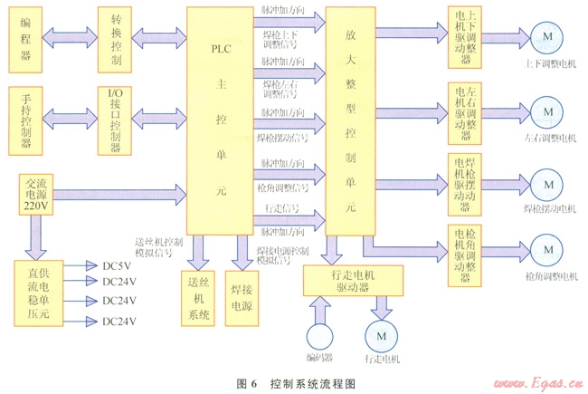 通過手持控制器可選擇具體的焊接工序及各種控制按鈕,經(jīng)I/O總線進(jìn)行控制命令的發(fā)送(圖6)。所有焊接參數(shù)均寫入編程器中,并通過轉(zhuǎn)換控制單元傳輸。信號最終傳輸給PLC主控單元進(jìn)行處理,經(jīng)放大給整形單元整形后傳輸給各電機(jī)驅(qū)動(dòng)器,進(jìn)而對相應(yīng)電機(jī)進(jìn)行運(yùn)動(dòng)控制。