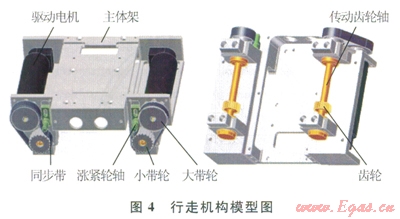 行走機(jī)構(gòu)主要由行走驅(qū)動(dòng)電機(jī)、大帶輪、小帶輪、同步帶、漲緊輪軸、主體架、傳動(dòng)齒輪軸、齒輪等組成(圖4)。