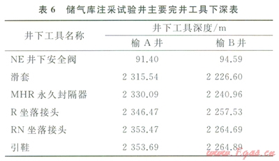 榆林南儲(chǔ)氣庫(kù)注采試驗(yàn)井榆A和榆B采用井下懸掛壓力汁測(cè)壓完井管柱。榆A井采用Æ114.3mm油管,完井管柱全井段最小內(nèi)徑67.7mm(RN坐落短節(jié)處);榆B井采用Æl39.7mm油管,完井管柱全井段最小內(nèi)徑112.9mm(RN坐落短市處)。完井工具入井前測(cè)試合格,完井管柱下入施工順利,封隔器一次坐封、試壓及功能測(cè)試正常。完井后鋼絲作業(yè)和連續(xù)油管儲(chǔ)層改造管柱通過(guò)順暢。