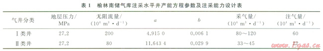 由于儲(chǔ)層非均質(zhì)性強(qiáng),氣井產(chǎn)能存在差異,榆林南儲(chǔ)氣庫(kù)注采井按照采氣量2類井(表1)設(shè)計(jì)。氣井二項(xiàng)式產(chǎn)能方程[2]如下:
