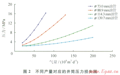 儲(chǔ)氣庫(kù)注采井產(chǎn)能高,油管對(duì)產(chǎn)量敏感。以無(wú)阻流量200×104m3/d的氣井為例,Æ114.3mm及以下尺寸的油管,隨著氣量的增加,井筒壓力損失增加明顯(圖2)。
