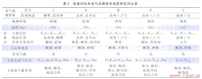 油氣成藏體系指地表以下油氣成藏的自然體系,包括形成油氣藏的一切要素,如烴源體、輸導體和圈閉以及這些元素之間有效的配置結果[6,11]。成藏體系以油氣聚集單位為中心,這是和含油氣系統(tǒng)以烴源巖為中心的本質(zhì)區(qū)別,因此,利用成藏體系能與勘探日標更緊密結合。油氣成藏體系的劃分主要有以下原則:①劃分油氣成藏體系時烴源巖和主要油氣運聚區(qū)兼顧;②1個具有統(tǒng)一油氣水界面的油氣藏只能屬于1個成藏體系;③對于多套烴源巖、多期成藏的多旋凹盆地,首先根據(jù)構造層、高壓封閉層等劃分成藏旋同(生儲蓋含油氣組合),然后再在平面上劃分成臧體系[11]。油氣成藏體系的劃分主要應用分割槽法或流體勢法[7,24],將運載層頂面(蓋層底面)的流體勢場分成幾個油氣運移方向和聚集區(qū),每1個運移方向所包含的生油巖及其上方的圈閉組合就構成了1個油氣成藏體系。利用該劃分方法,并結合該區(qū)油(氣)源對比分析的結果,南俸凹陷町劃分為5個油氣成藏體系(圖1)。各油氣成藏體系的地質(zhì)特征見表2。