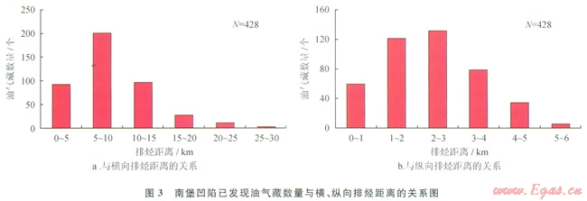 對428個構造油氣藏排烴距離的統(tǒng)計表明(圖3-a),油氣藏主要分布在橫向排烴距離為0~15km范圍,其中5~l0km范圍內(nèi)最多,達201個。當橫向排烴距離超過10km,油氣藏的個數(shù)隨排烴距離的增加旱減小的趨勢。這是由于在地質(zhì)條件下,隨烴源巖排烴距離的增加,烴源巖排出的烴類更容易遭受各種形式的殘留及損耗,導致運移至儲層的烴類逐漸較少,由此削弱了烴源巖的供烴效率。另外,統(tǒng)計規(guī)律還表明,縱向排烴距離亦和油氣藏個數(shù)具有類似的規(guī)律(圖3-b),油氣藏主要集巾在小于4km的范圍。