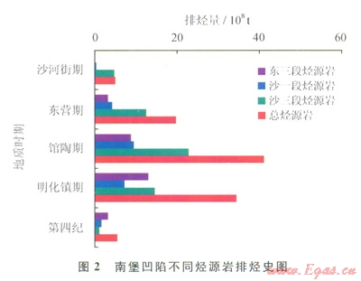 南堡凹陷3套烴源巖熱演化程度有所差異,因此不同烴源巖的主要排烴時期和排烴量也存在差異(圖2)。沙三段烴源巖發(fā)生大規(guī)模排烴的時間較早,在沙河街組沉積期就發(fā)牛一定規(guī)模的排烴過程,東營組沉積期以來發(fā)生了大規(guī)模的排烴過程;沙一段和東三段烴源巖發(fā)生大規(guī)模排烴的時間較晚,其大規(guī)模排烴的時間主要集中在館陶組沉積期以來??偟膩碚f東營期、館陶期和明化鎮(zhèn)期是主要的排烴期,且3套烴源巖均只有1次排烴高峰期,說明南堡凹陷只有1次主要成藏期。且至今仍在成藏過程中,這和前人利用烴類流體包裹體均一化溫度分析結果一致。南堡凹陷發(fā)生油氣充滓過程的時間跨度大,從東營組沉積時期至第四系沉積時期均有油氣成藏[20]。