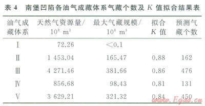 K值的大小關系到所預測氣藏的個數(shù)及氣藏的規(guī)模。在K值的獲取過程中,普遍采用的方法是依據(jù)已發(fā)現(xiàn)油氣藏的儲量和規(guī)模數(shù)據(jù)來進行擬合,因此所需要的油氣藏數(shù)據(jù)較多。而南堡凹陷已發(fā)現(xiàn)的油氣藏個數(shù)總體并不太多,尤其氣藏個數(shù)更少,因此,有必要對K值的求取方法進行改進。針對南堡凹陷各油氣成藏體系,本次研究基于渤海灣盆地油氣資源動態(tài)評價的認識,將l5×104t油氣當量的油氣藏作為商業(yè)油氣勘探開發(fā)的下限(最小油氣藏規(guī)模),以儲量規(guī)模最大的油(氣)藏為第l序號油氣藏,取任意K值進行擬合,K值的最終確定需要滿足以下2個條件:①使得最大序號油(氣)藏的儲量接近l5×104t;②所有油氣藏的儲量之和接近成藏體系的油氣資源總量。由此擬合得到K值和油氣藏個數(shù),表4為南堡凹陷各成藏體系氣藏個數(shù)與K值擬合結果,其中南堡Ⅲ號成藏體系氣藏的個數(shù)最多,為476個。