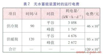 當(dāng)無水蓄能裝置時,地源熱泵機組只在峰值和平谷時段運行,每天運行時間為11h。按式(1)、(2)計算無水蓄能裝置時的運行電費,結(jié)果見表2。