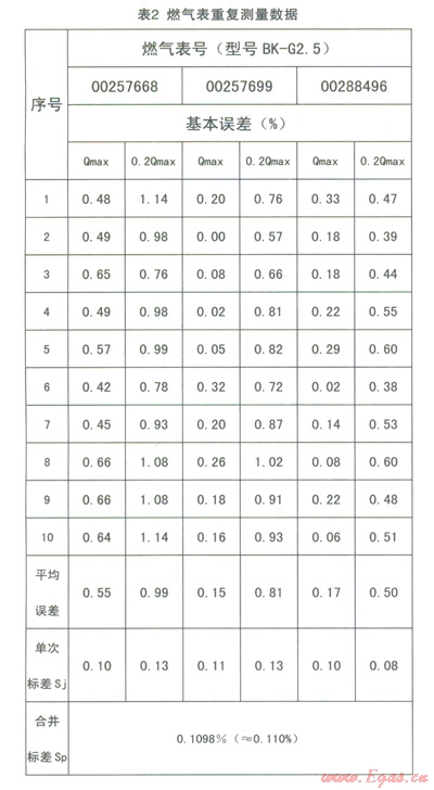 取三臺B級BK-G2.5型的皮膜式燃氣表,選擇Qmax(4.0m3/h)和0.2Qmax(0.8m3/h)兩個流量點連續(xù)測量10次得到6組測量數(shù)據(jù)(見表2),計算每組測量列的平均誤差di,然后按照貝賽爾公式可以算出每組測量列的單次實驗標準差Sj,再推算出6組實驗標準差的合并樣本標準差Sp,則有:u(v1)=Sp
