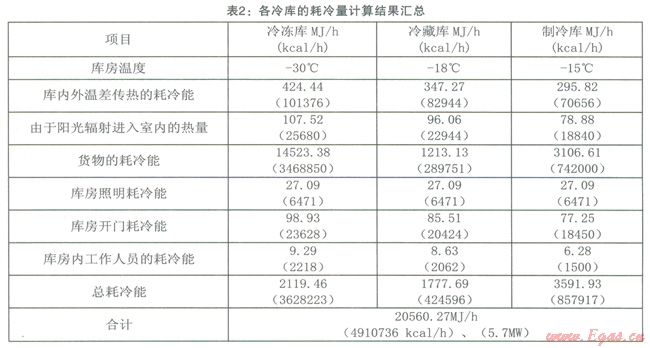 每個(gè)工作人員產(chǎn)生的熱量與庫(kù)房溫度有關(guān)。凍結(jié)間按l.59MJ/h(355kcal/h),低溫冷藏間按1.26MJ/h(300kcal/h),高溫冷藏庫(kù)按1.00MJ/h(240kcal/h)考慮。工作人員按50人考慮。計(jì)算可得三座冷庫(kù)庫(kù)房?jī)?nèi)工作人員產(chǎn)生的耗冷量分別為9.29MJ/h、8.63MJ/h、6.28MJ/h(2218kCal/h、2062kCal/h、1500kcal/h)。將各個(gè)冷庫(kù)耗冷量的計(jì)算結(jié)果匯總,列于表2。