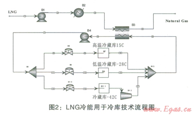 為了有效利用液化天然氣的冷能,可以將食品凍結(jié)及加工裝置、冷凍庫(kù)、冷藏庫(kù)及預(yù)冷裝置等按不同的溫度帶連成一串。按LNG的不同溫度帶,用不同的冷媒與之換冷后分別送入低溫凍結(jié)庫(kù)或低溫凍結(jié)裝置(-60℃)、冷凍庫(kù)(-35℃)、冷藏庫(kù)(0℃以下)以及果蔬冷藏庫(kù)(0~10℃)。這樣可以使LNG的冷能幾乎無(wú)浪費(fèi)的得以利用,利用效率大大提高,冷庫(kù)運(yùn)行成本下降37.5%。與傳統(tǒng)低溫冷庫(kù)相比,采用LNG冷能的冷庫(kù)具有占地少、投資省、溫度梯度分明、維護(hù)方便等優(yōu)點(diǎn)。
