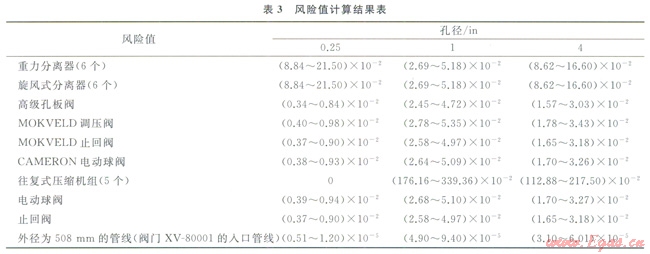 設備或管線的風險值為失效后果和失效概率的乘積(表3),設備風險要比管線風險大得多,而其中5套壓縮機組不論是失效后果還是失效概率都是最大的,其次是重力分離器和旋風式分離器,以上所得風險數(shù)值為相對比較數(shù)值,不同站、同站不同區(qū)域之間沒有可比性。