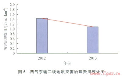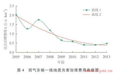 西氣東輸管道地質(zhì)災(zāi)害維護(hù)費用統(tǒng)計如圖4、5所示,圖4中的曲線l為管道地質(zhì)災(zāi)害風(fēng)險治理維護(hù)費用曲線,曲線2為二次擬合曲線。2條曲線的趨勢表明:西氣東輸一線在開展地質(zhì)災(zāi)害完整性管理后,管道地質(zhì)災(zāi)害風(fēng)險治理維護(hù)費用逐年降低,當(dāng)前治理費用水平約為2005年的l/4,并趨近于穩(wěn)定水平。圖5數(shù)據(jù)表明西氣東輸二線投產(chǎn)第一年地質(zhì)災(zāi)害治理費用與西氣東輸一線2005年相比減少約l/3,且治理費用逐年下降。2013年西氣東輸二線治理費用比西氣東輸一線約高l倍,預(yù)計未來幾年堅持管道地質(zhì)災(zāi)害完整性管理后,西氣東輸二線地質(zhì)災(zāi)害管理將逐步趨于穩(wěn)定水平。