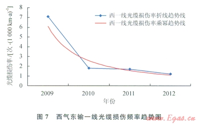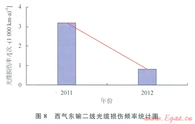 圖7表明,西氣東輸一線管道斷纜頻率由2009年的7.1次/(1090km·a)降至2010年的l.8次/(1000km·a),并呈逐年下降之勢,說明2009年開始逐步實施第三方損壞完整性管理工作后,施工機械等可能威脅管道安全的第三方施工次數(shù)顯著減少,管道安全水平逐步提高。由圖8可以看出,2011年西氣東輸二線投產(chǎn)運行初,在第三方損壞完整性管理指導(dǎo)下光纜中斷次數(shù)處于較低水平,并呈下降趨勢。