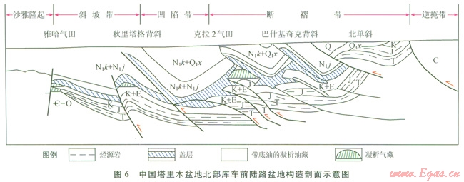 5)構(gòu)造樣式:根據(jù)現(xiàn)有的物探、地質(zhì)資料,將前陸盆地構(gòu)造樣式劃分為8種構(gòu)造模式:擠壓背斜、滑脫背斜、牽引背斜、斷背斜、背沖構(gòu)造、雙重構(gòu)造、疊瓦構(gòu)造、鹽構(gòu)造。