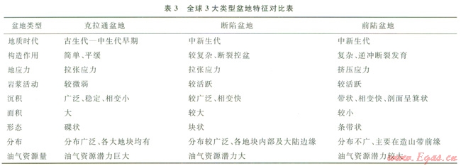 4 全球3大類沉積盆地特征對(duì)比
