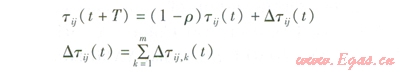 需要注意的是,在每只螞蟻走完一步或者完成對所有n個節(jié)點的遍歷后,要對殘留信息進行更新處理,否則過多的殘留信息會淹沒啟發(fā)信息。因此,在螞蟻經(jīng)過一個節(jié)點或經(jīng)過所有節(jié)點完成一個循環(huán)所需的時間T后,即t+T時刻在節(jié)點i與j路徑上的殘留信息量tij(t+T)可按以下規(guī)則進行調(diào)整: