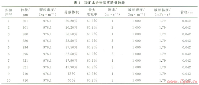 王武昌等[11]對(duì)四氫呋喃(THF)水合物在水平管道中的流動(dòng)狀態(tài)進(jìn)行了大量實(shí)驗(yàn)研究(表1),研究?jī)?nèi)容包括顆粒粒徑、濃度以及流速等對(duì)水合物漿流動(dòng)狀態(tài)的影響,筆者以其實(shí)驗(yàn)數(shù)據(jù)為參照,對(duì)模型計(jì)算結(jié)果進(jìn)行了對(duì)比。