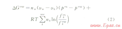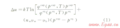 式中Du為過飽和度,J;DGexp為吉布斯自由能的變化量;pep為相平衡壓力,MPa;pexp為實(shí)驗(yàn)條件下的壓力,MPa;R為氣體常數(shù),kJ/(mol·K);T為系統(tǒng)溫度,K;k為波爾茲曼常數(shù);nw為水合數(shù);uw為水分子的體積,m3;uh為單個水合物晶胞的體積與平衡壓力下所含有的氣體分子數(shù)的比值,m3;nk為氣體分子的數(shù)量;¦keq為相平衡條件下k組分氣體的逸度系數(shù);¦kexp為實(shí)驗(yàn)條件下k組分氣體的逸度系數(shù);jeq為相平衡條件下氣體的逸度系數(shù);jexp為實(shí)驗(yàn)條件下氣體的逸度系數(shù)。