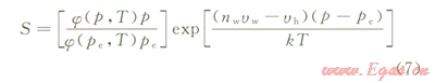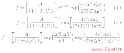 Kashchiev與Firoozabadi[28]通過分析晶體的成核過程,認(rèn)為水合物的成核首先發(fā)生在氣液接觸面而不是液相的內(nèi)部,基于此,提出了適用于單組分均相成核與三維非均相成核速率模型。研究了添加劑對水合物成核速率的影響,得到了與之相對應(yīng)的模型(4~6)。由于該模型與實(shí)驗(yàn)數(shù)據(jù)吻合較好,更加接近于水合物的真實(shí)成核過程,且方程的求解較簡單,因而被廣大學(xué)者所接受。即
