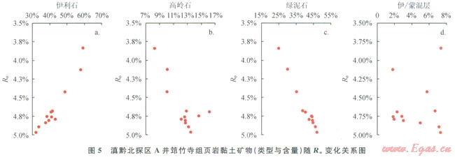 研究區(qū)筇竹寺組頁(yè)巖熱演化程度較高,R。均大于3.0%。根據(jù)巖心不同黏土礦物含量隨R。的變化關(guān)系圖(圖5)可以看出,隨R。的增大,具有較大比表面積的伊利石含量增大、伊/蒙混層含量減少,具有較小比表面積的綠泥石含量增大、高嶺石含量增大。而上覆的龍馬溪組頁(yè)巖熱演化程度相對(duì)低些(R。多小于3.0%),與筇竹寺組頁(yè)巖黏土礦物相比,其伊利石含量高(13%~36%)、伊/蒙混層含量比較少(2%~6%)、綠泥石含量高(13%~32%)、高嶺石含量高(6%~9%)。因而出現(xiàn)了筇竹寺組黏土礦物間微孔隙的比表面積和孔體積遠(yuǎn)比龍馬溪組小的情形,導(dǎo)致其比表面積和孔體積均較小的狀況(表2)。因此,熱演化程度通過(guò)對(duì)黏土礦物類(lèi)型與含量的影響,也同樣控制著黏土礦物間微孔隙的發(fā)育程度。由此得出,已處于過(guò)成熟中期后的滇黔北筇竹寺組頁(yè)巖層,經(jīng)歷悠久的地質(zhì)作用過(guò)程和過(guò)高熱演化程度嚴(yán)重制約了其微觀孔隙結(jié)構(gòu)特征,呈現(xiàn)微孔隙驟減和比表面積、孔體積明顯較小的情形,不利于頁(yè)巖氣的吸附儲(chǔ)集,結(jié)果出現(xiàn)筇竹寺組頁(yè)巖氣富集程度不如龍馬溪組的狀況。