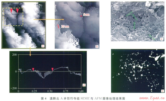 通過(guò)將A井筇竹寺組具有代表性的頁(yè)巖巖心拋光樣品進(jìn)行AFM和SEME圖像處理與分析,將圖像數(shù)據(jù)導(dǎo)入ArcGIS平臺(tái)中進(jìn)行柵格重分類(lèi)分析,圖像中白色區(qū)域?yàn)榭紫痘蛄严斗植紖^(qū)(圖4-d、4-c)。由此計(jì)算出不同樣品中微觀孔隙的孔隙數(shù)量及其面孔率(表1)。與龍馬溪組頁(yè)巖相比,筇竹寺組頁(yè)巖具有微觀孔隙數(shù)量多、孔徑小、單孔面積小、而孔率大的特征。由AFM剖面圖清晰地顯示出,規(guī)則排列的柵格間為納米級(jí)孔隙,具有鋸齒狀緊密排列的結(jié)構(gòu)特征(圖4-a、4-c),這種規(guī)則的呈明暗相間的柵格狀表面形態(tài)特征可能是頁(yè)巖中干酪根大分子團(tuán)緊密排列的結(jié)果[27-28]。