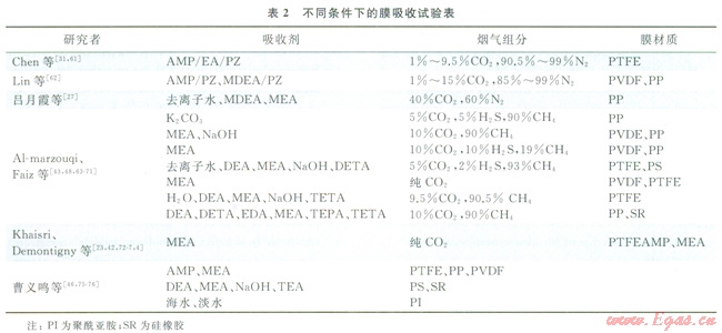 此外,由于單一吸收劑不能完全滿足高再生性能與高吸收速率,研究者們在混合吸收劑的探索中取得了較大進(jìn)展。常用的活化添加劑有醇胺、烯胺以及脂肪胺等。Wongrong等[58]發(fā)現(xiàn)在MEA中添加甘氨酸鈉溶液吸收效果有較大改善。Chen等[59]考察了6種不同配比的MEA/MDEA和PG/MDEA混合液,發(fā)現(xiàn)當(dāng)MDEA在混合液中比例為3:2時,脫除效率可達(dá)99%,并且反應(yīng)更持久。楊波等[60]在氨基酸鉀中加入活化劑哌嗪(PZ)后,捕集濃度為15%的CO2模擬煙氣,CO2脫除率得到不斷提升。晏水平[53]通過大量實驗研究了不同配比混合吸收劑的吸收與再生性能,發(fā)現(xiàn)在三級胺溶液中添加中等含量活化劑時性能最佳。表2總結(jié)了部分國內(nèi)外學(xué)者進(jìn)行膜吸收試驗的條件及參數(shù)。綜上所述,MEA/TEA、PZ/TEA、MEA/MDEA、PZ/MDEA、MEA/AMP、PZ/AMP和PZ/DEA等混合吸收劑體現(xiàn)了良好的綜合性能。因此,采用具有高CO2吸收和再生性能的吸收劑組成的混合吸收劑理論上能獲得較好的CO2吸收與再生綜合性能。所以,在規(guī)?;瘧?yīng)用中,應(yīng)當(dāng)根據(jù)實際情況進(jìn)行適當(dāng)?shù)蛘?,確定最優(yōu)的活化劑種類與濃度,達(dá)到最佳吸收效果,找到一種高效吸收與再生的吸收劑。