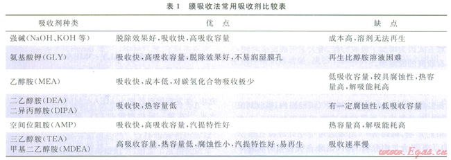 表1為常見的膜吸收法中CO2吸收劑的吸收與解吸性能。其中CO2吸收性能排序為NaOH>GLY>MEA>DEA>DIPA>AMP>TEA>MDEA>H2O;CO2再生性能排序為TEA≈MDEA>DEA>AMP>DIPA>MEA>NaOH。