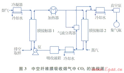 為研究不同來源原料氣下膜吸收法的吸收與解吸特性,比較傳統(tǒng)與非傳統(tǒng)再生方法的差異,改善當(dāng)前解吸能耗大、能源浪費等問題,筆者提出一種采用中空纖維膜接觸器分離煙氣中CO2的方法及系統(tǒng)(圖3),試驗流程主要包括煙氣冷凝、膜吸收以及CO2解吸再生3大部分。燃煤尾氣經(jīng)煙氣冷凝器降溫后,送入中空纖維膜接觸器1,與吸收劑充分反應(yīng),其中CO2被吸收,吸收富液經(jīng)過加熱器,在中空纖維膜接觸器2中減壓再生或氣液分離器中分離出CO2,最后通過真空泵調(diào)節(jié)真空度,收集高濃度CO2氣體。而再生后的吸收貧液則經(jīng)過冷凝器降溫返回吸收液箱,進(jìn)行連續(xù)循環(huán)流動試驗。同時此方法也可以采用模擬煙氣進(jìn)行試驗,與實際煙氣對比研究。該系統(tǒng)首次對煤、天然氣、生物質(zhì)產(chǎn)氣鍋爐實際煙氣進(jìn)行排放處理,同時也可對周期性循環(huán)進(jìn)行單根、串聯(lián)與并聯(lián)膜組件吸收試驗,對比CO2傳統(tǒng)與非傳統(tǒng)再生試驗,研究水蒸氣、N2等不同吹掃氣氛下的CO2回收特性以及考察真空度變化對CO2純度的影響[77]。