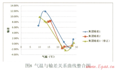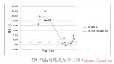 由表l的計算結(jié)果可知,擬合效果很好。因此,可得到回歸方程:y=0.011x3-0.621x2+10.260x-43.096(注:x為氣溫單位℃,y為百分?jǐn)?shù)表示的輸差),其曲線如圖9所示: