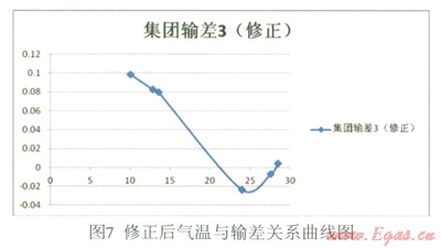 由圖9可知,輸差存在極值,不會永遠(yuǎn)增大或減小。對回歸方程求導(dǎo)可得:y=0.033x2-1.242x+10.260,令其等于零則可以得出函數(shù)的極值為:x1=12.35,x2=24.95。將x代入回歸方程可以求得對應(yīng)的輸差分別為:y1=9.62,y2=2.84。因此,輸差的極大值應(yīng)該出現(xiàn)在12℃左右為9.62左右,極小值應(yīng)該出現(xiàn)在25℃左右為-2.84左右。
