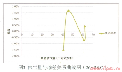 (3)在現(xiàn)有數(shù)據(jù)基礎(chǔ)上,暫未發(fā)現(xiàn)供氣量與輸差之間的明顯函數(shù)關(guān)系。但是,從圖8觀察發(fā)現(xiàn),輸差曲線1、2、3(修正)對應(yīng)的供氣量依次為:41—45、56—60、61—66,單位千萬立方米。隨著供氣量的大幅上升,輸差曲線呈向左下方平移的趨勢。即溫度等其他條件一定的情況下,隨著供氣量的大幅增加,輸差有減小的趨勢。初步分析,可能是由規(guī)模效應(yīng)導(dǎo)致。此推斷是否成立有待進(jìn)一步的研究,可做為下一研究課題。