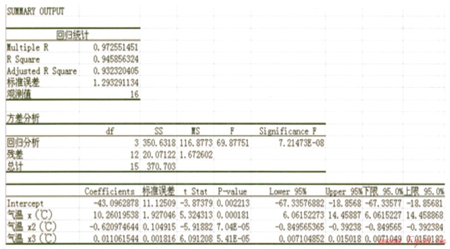 由以上分析可知,建立供氣量、氣溫對于輸差的二元方程已不可行??煽紤]建立氣溫對于輸差的一元多次函數(shù)。經(jīng)嘗試一元二次、三次、四次等多種函數(shù)模型后,找到氣溫對于輸差的最優(yōu)一元三次回歸方程。其回歸分析結(jié)果如下: