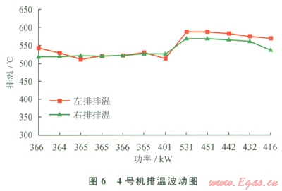 在10口井的試驗中,GTI混合燃料技術(shù)基本能滿足各個工況下鉆機對柴油機動力的需求,對突加負荷的滿足能力較強,當運行參數(shù)超過設(shè)定的安全值,能立即平穩(wěn)地轉(zhuǎn)為純柴油模式,保證動力供給的連續(xù)性。起下鉆工況下,4號柴油機最低排溫511℃,最高排溫576℃,均在安全范圍內(nèi)。其排溫曲線和振動變化如圖6、7所示。