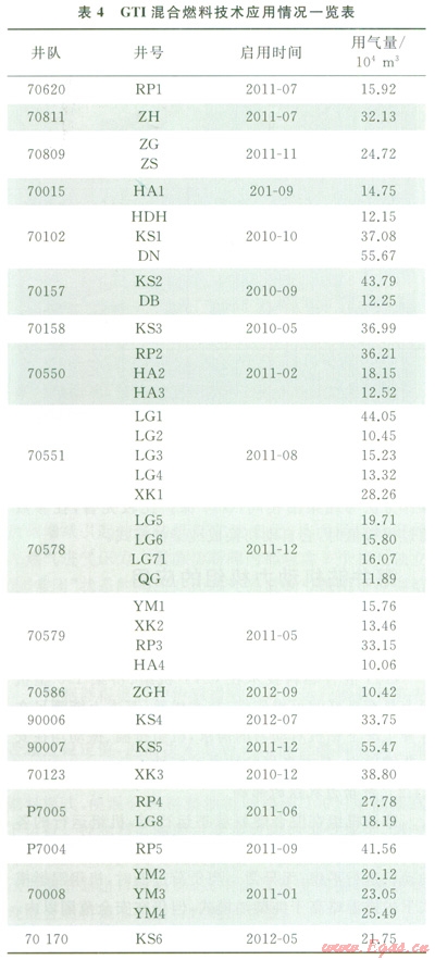 GTI混合燃料技術(shù)性能穩(wěn)定,安全性高,具有良好的經(jīng)濟效益。目前,GTI技術(shù)應用21個鉆井隊,應用井數(shù)40口,累計用氣量達935×104m3。GTI混合燃料技術(shù)應用情況如表4所示。