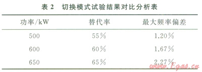4)切換模式對比分析。分別在500kW、600kW和650kW 3種工況下,進行天然氣切斷時的響應測試,最大頻率偏差2.27%,小于國家標準5%。分別在500kW(替代率55%)、600kW(替代率60%)和650kW(替代率65%)工況下,GTI機組頻率增加均沒有超過l%。試驗結(jié)果表2所示。