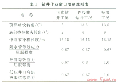 2)隔水管作業(yè)技術(shù)研究主要是依據(jù)設(shè)計得到的管柱排列和張緊力,結(jié)合給定海域的海況條件和依托平臺的具體情況,同時也要考慮井口、導(dǎo)管參數(shù)以及土壤條件,確定隔水管鉆井作業(yè)窗口、下放/回收作業(yè)窗口和硬懸掛作業(yè)窗口,確定各個窗口對應(yīng)的極限作業(yè)參數(shù)與極限環(huán)境條件,保證隔水管作業(yè)的安全性。
