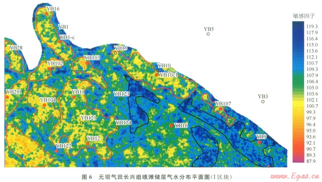 另外從預(yù)測的元壩氣田l區(qū)塊長興組氣水分布平面圖(圖6)來看,整體上有利含氣區(qū)主要分布在西邊及北邊,東南邊多為產(chǎn)水區(qū)及氣水同層區(qū),其刻畫的氣水平面展布與實(shí)鉆井揭示的規(guī)律基本上保持一致。從圖6中可以看到:含氣區(qū)(紅黃色區(qū)域)與含水區(qū)(藍(lán)色區(qū)域)分布清晰。處于黃色區(qū)域(紅圈內(nèi))的井,均獲得了工業(yè)性氣流。尤其處于紅黃色富集區(qū)域的YBl04井以及YB10cl井,獲得了日產(chǎn)天然氣過百萬立方米的產(chǎn)能。藍(lán)色區(qū)域則為含水區(qū)(圖中黑圈內(nèi)),處于該區(qū)域的YB9井在長興組鉆遇水層,日產(chǎn)水30m3。綠色區(qū)域?yàn)闅馑瑢訁^(qū),該區(qū)域的YBl23井、YBl6井測試結(jié)果既產(chǎn)氣也產(chǎn)水。